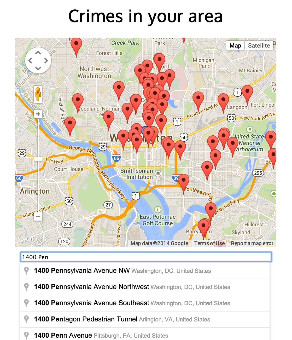My final project was the toughtest of the course. It was built primarily on Ruby on Rails and Backbone.js. The app ingests crime data from the D.C. Open Data Catalog and plots it on Google Maps. This was my first project where architectural concerns played an important role (should I geocode on the client side or backend).